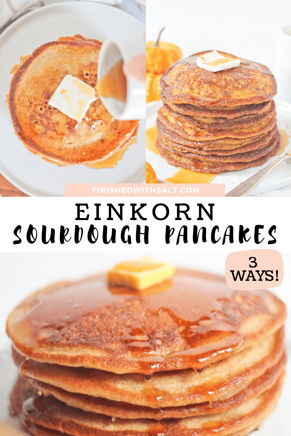 A collection of three different easy and fluffy from scratch Einkorn Sourdough Pancake recipes, all using einkorn flour! Choose between sourdough discard pancakes, fully fermented sourdough starter pancakes without any added flour or einkorn sourdough pumpkin pancakes!Â